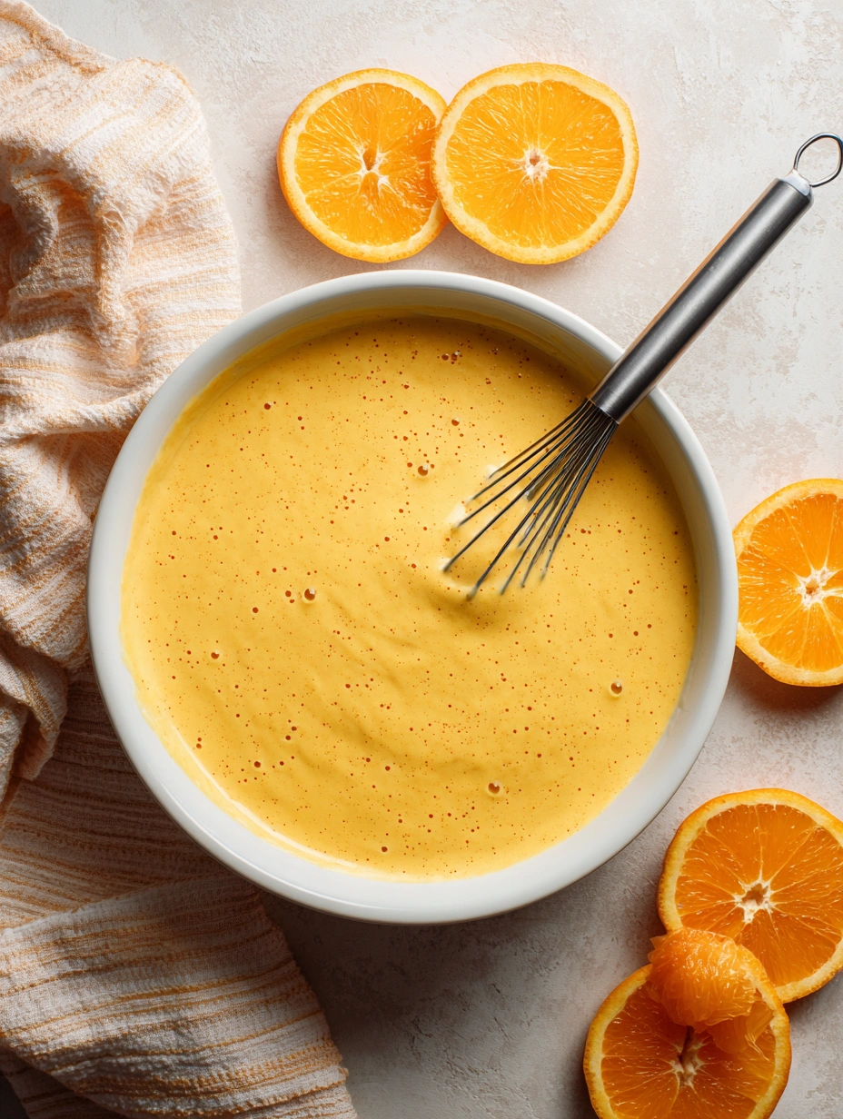 In another bowl, whisk orange juice, zest, sugar, oil, and vanilla